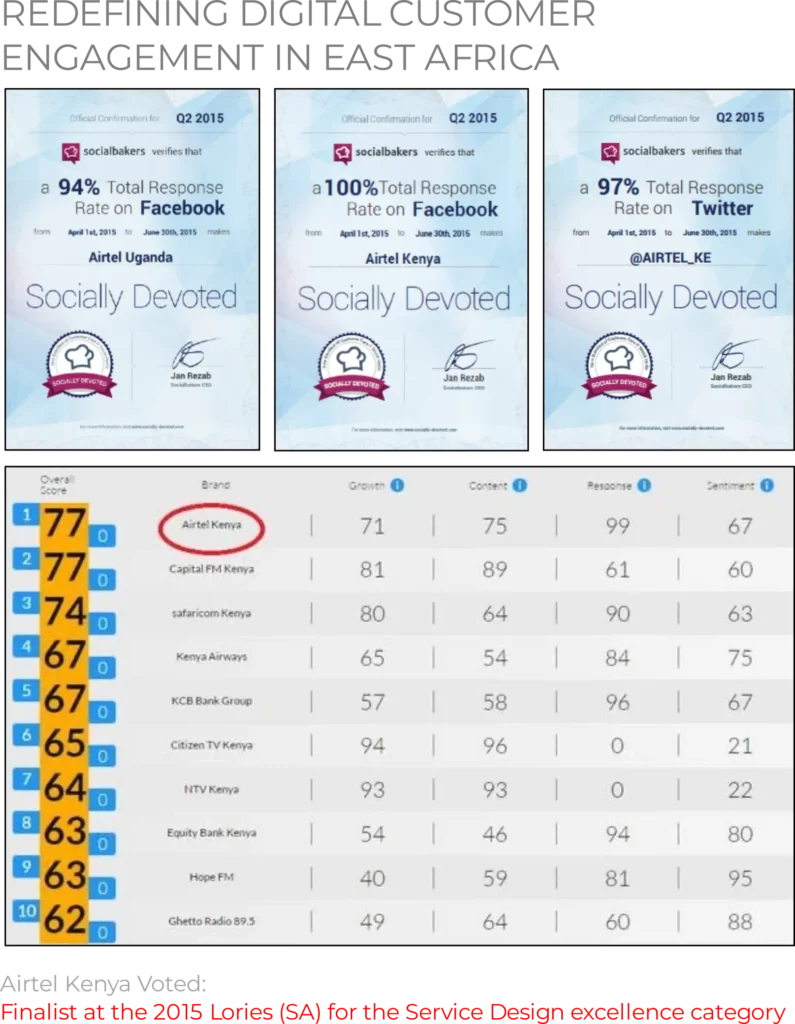 Airtel Kenya was positioned as the online leader for three consecutive years, with Airtel Uganda and Airtel Rwanda also achieving top rankings shortly after Kenya. Our success was recognised as a finalist in the Innovation/Digital Experience category at the 2015 Loeries. We significantly reduced the online response time from 5 minutes to under 3 minutes in less than 3 months. Turnaround time was also greatly improved. The NPS score surpassed 80%, and the turnaround time was reduced to 3 minutes. Airtel became a Best Practice Global Case Study according to Social Bakers in 2015.
